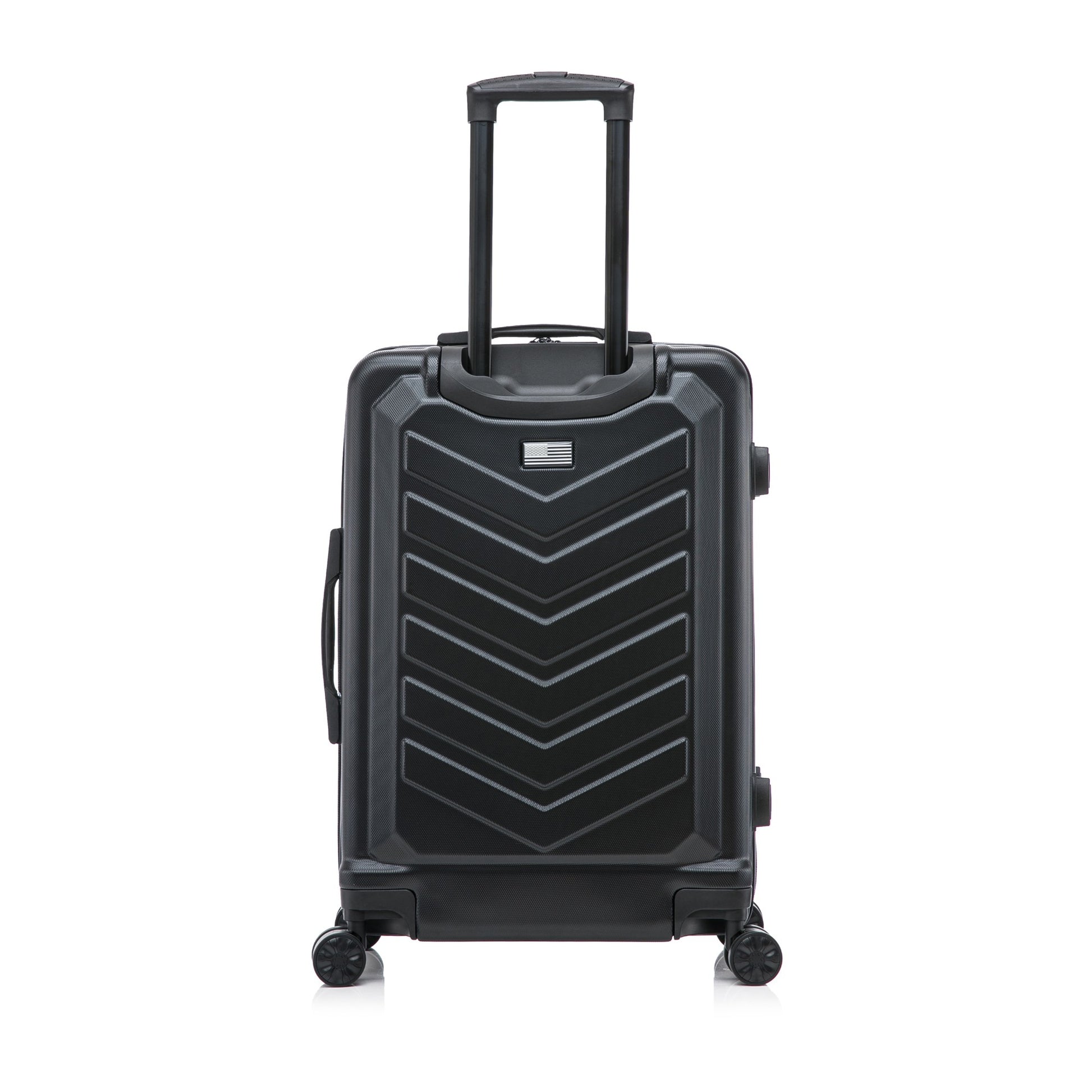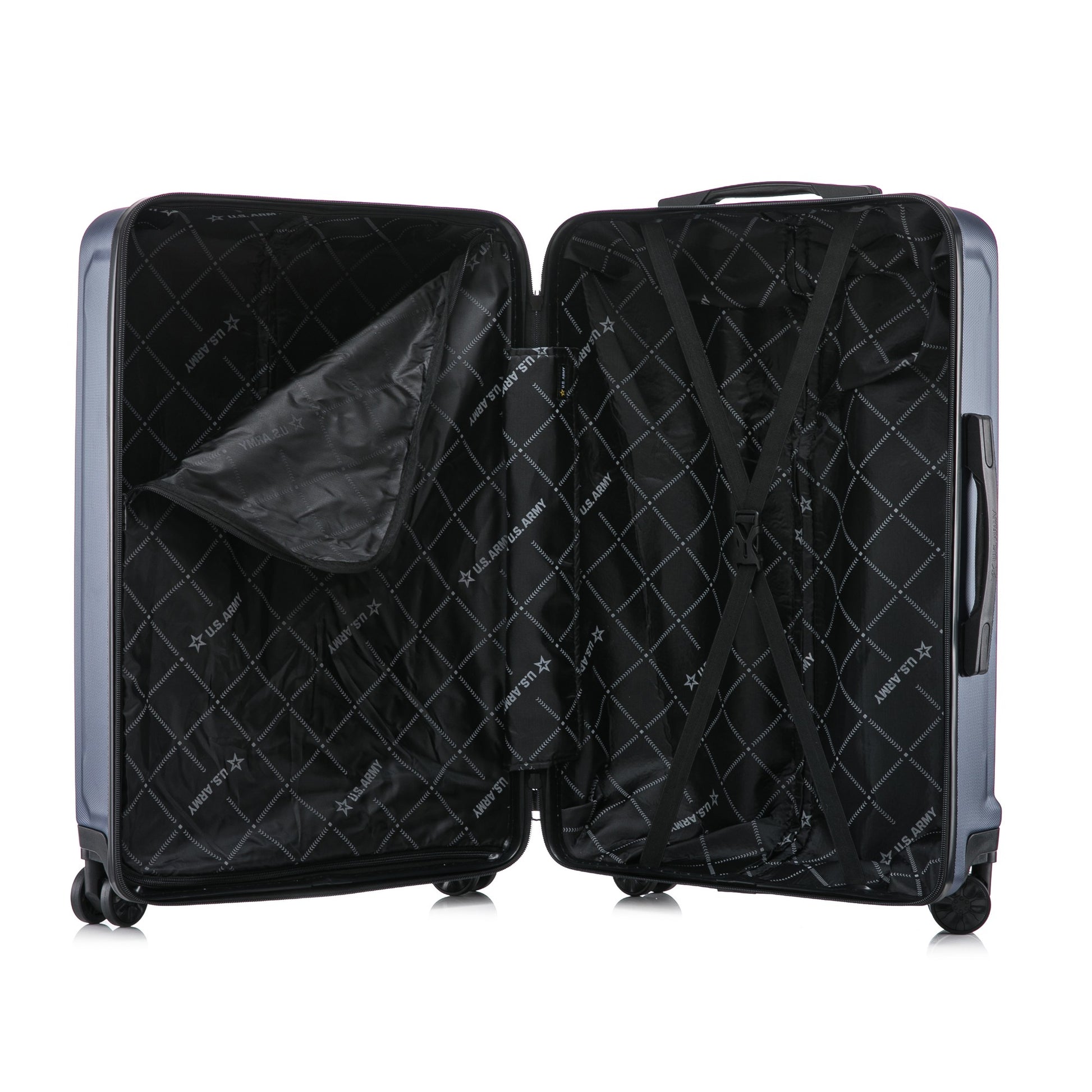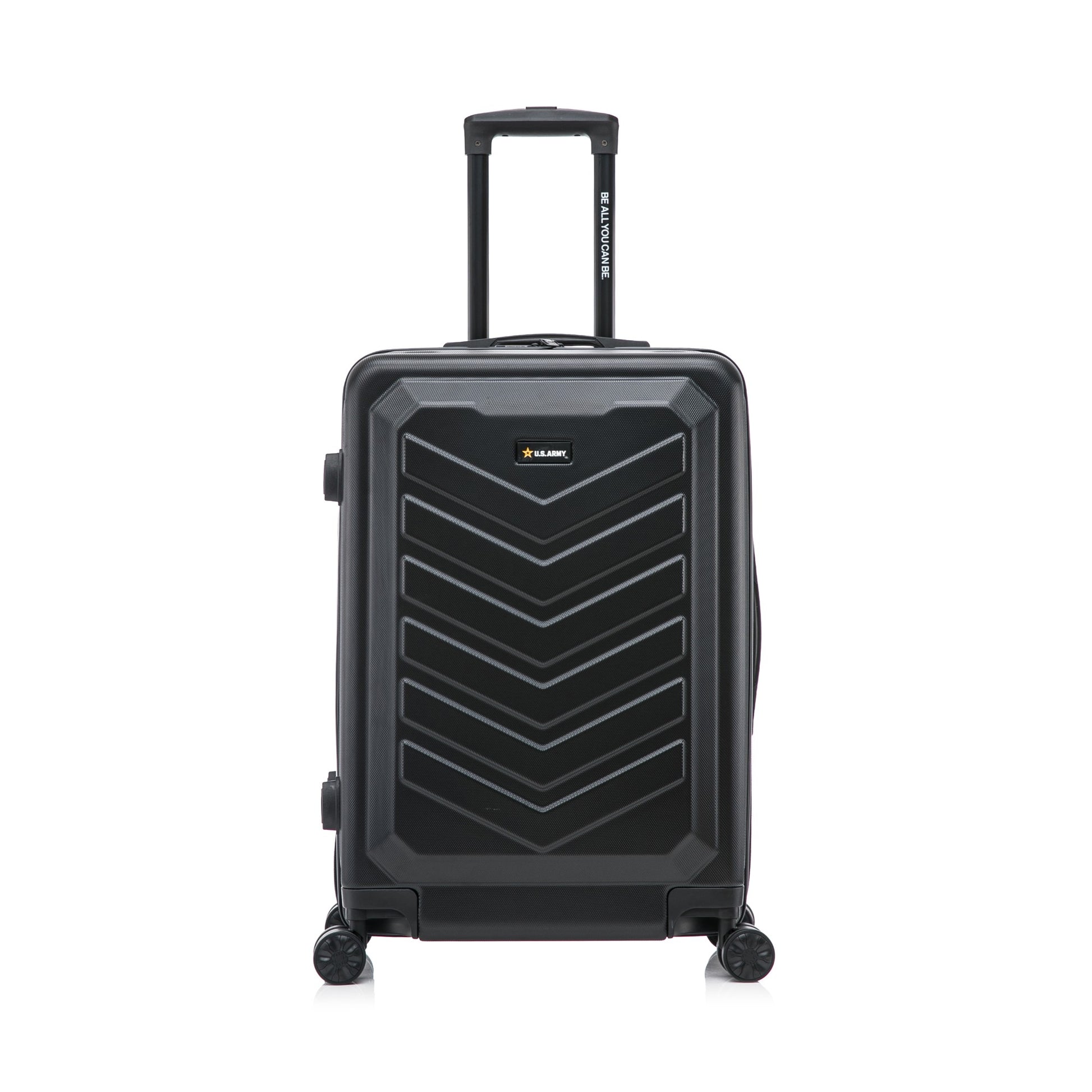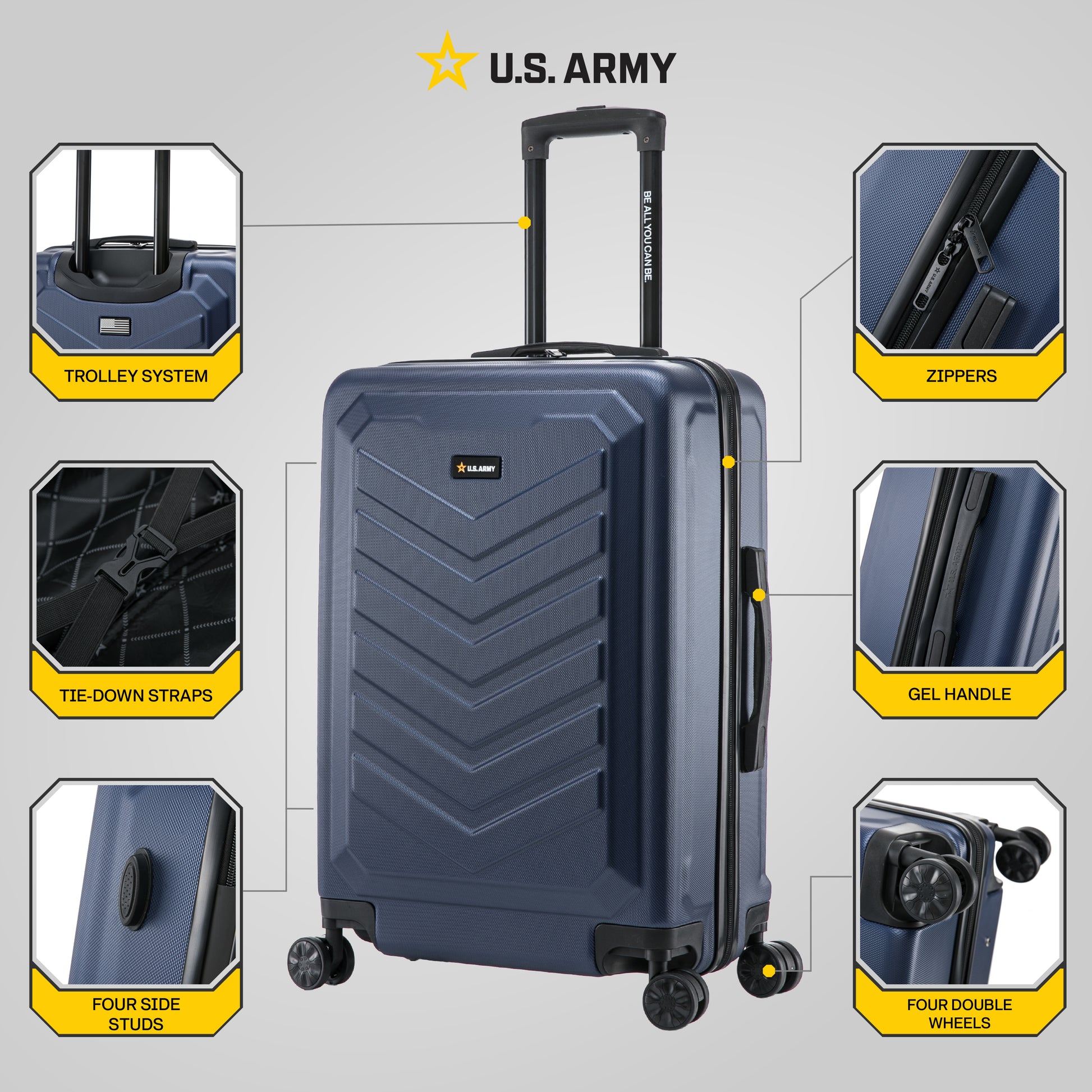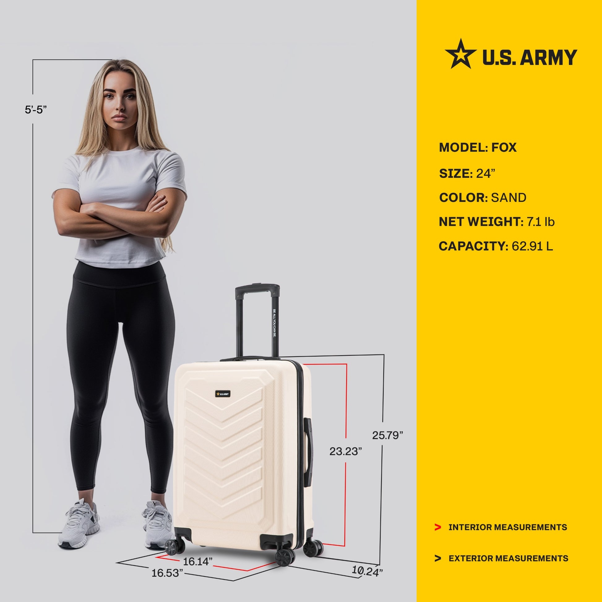 The U.S. ARMY FOX Collection large 24" suitcase is a tribute to the bravery and strength of the U.S. Army. Tailored for the ambitious explorer, this suitcase is your ultimate companion for shorter trips. Designed with the iconic Army chevron marks and other emblematic symbols, it embodies power and endurance.... Crafted for both durability and style in mind, this suitcase features a lightweight hard-flex shell, enduring most rigors of travel and scratch-resistant, offering peace of mind that your belongings are protected no matter the conditions. The suitcase glides on four double multi-directional spinner wheels for effortless mobility through busy terminals or city streets. Inside, the fully lined interior includes a zippered compartment on one side and snap-on elastic cross straps on the other, simplifying the packing process and keeping your items secure during transit. With ergonomic gel handles, lifting and carrying your suitcase is comfortable and strain-free, while smooth-gliding zippers and side studs provide quick and easy access the interior. Purchase of officially licensed U.S. Army merchandise aids the morale, welfare and recreation (MWR) program, which benefits the lives of soldiers, retirees, and their families.